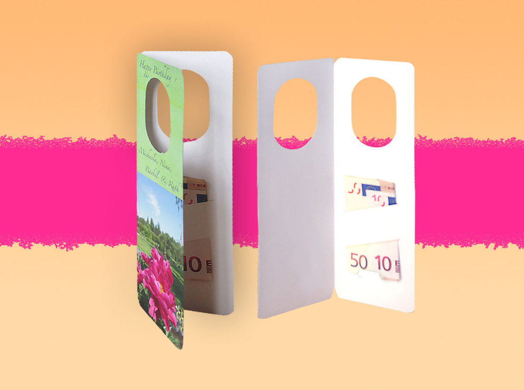 Wir bekamen ein Foto zugeschickt, das uns zeigte, wie aus unseren Flacapo-Druckbogen pfiffige Geldgeschenke gebastelt werden können. Die Idee gefällt uns.